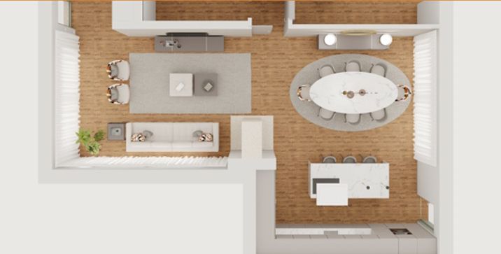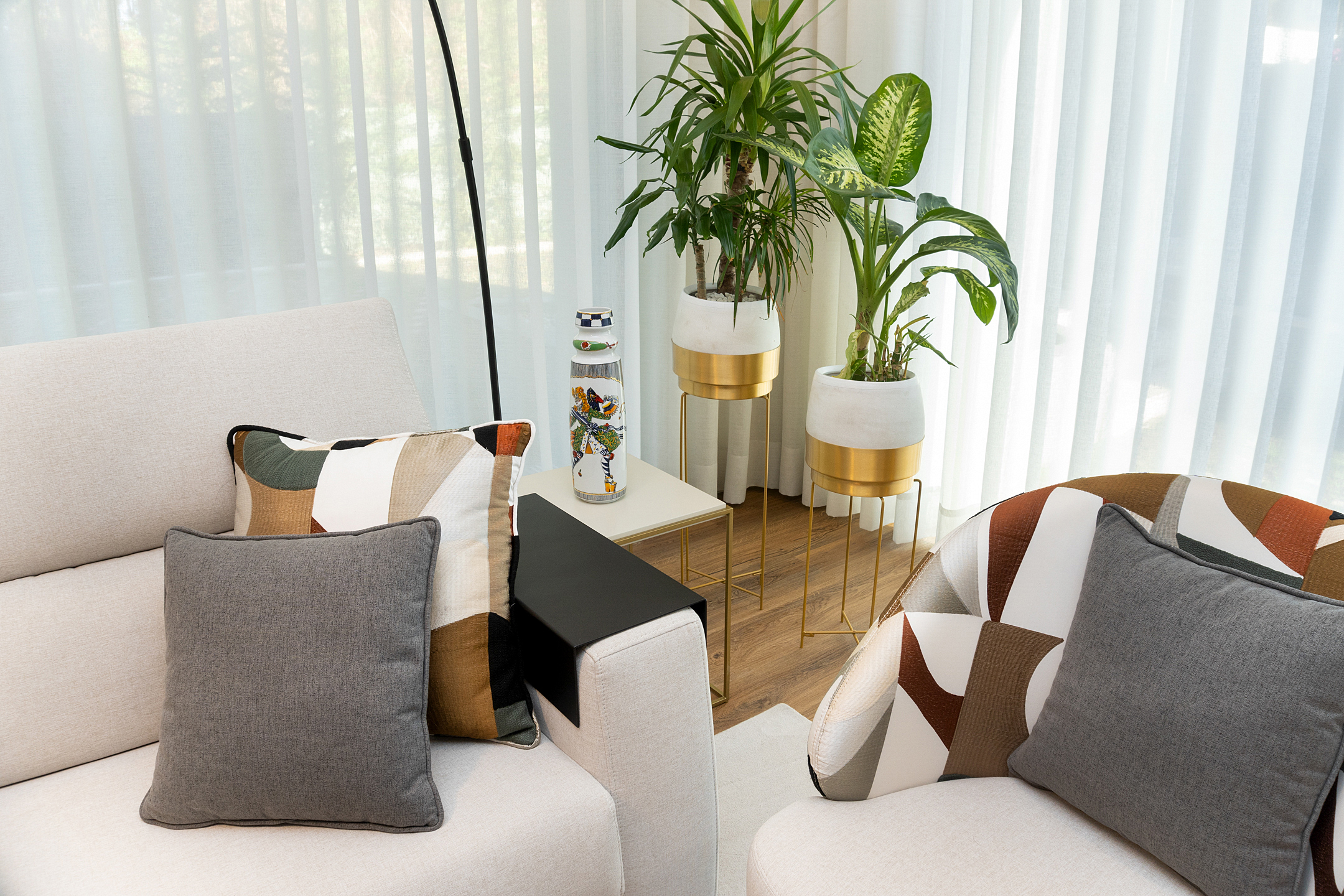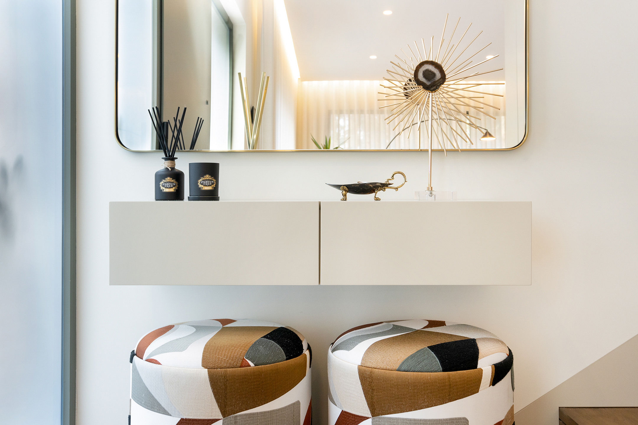 Moodboard desenvolvido para harmonizar texturas, tons e volumes. A proposta materializa-se numa sala ampla, com mobiliário personalizado e soluções funcionais.